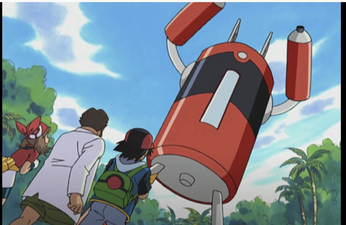 Team Rocket, who had been chasing them all day; come in with their latest mecha, which conveniently is able to finish bleeding off the excess electric discharge and send them blasting off! It also fries May's bike, which is a gag that does end up getting gradually phased out over time; and we'll talk more another day.